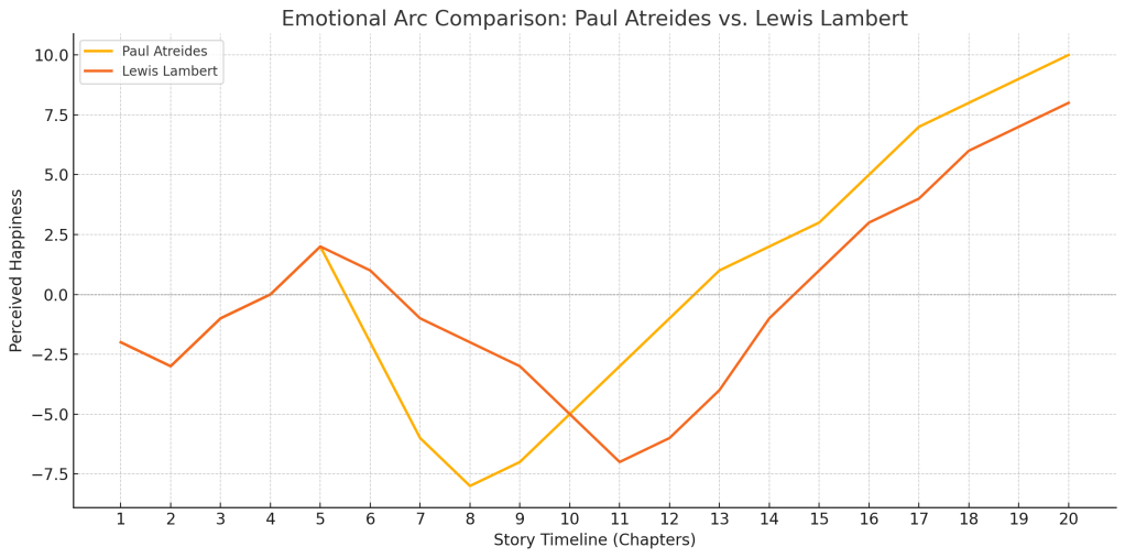 As I reread Dune while finishing Guardians for the Celestial Nexus, I realized something: both Paul Atreides and Lewis Lambert ride emotional rollercoasters that echo classic mythic structures—rising from confusion to clarity, from despair to purpose. But while their trajectories may run parallel, their modes of leadership and sources of resilience differ in fascinating ways.